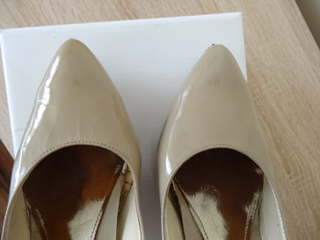Chciałabym aby były ponownie obłożone w całości nową skórą - najchętniej NIElakierowaną w podobnym kolorze (jasny beż, capuccino). Buty mają mocno zdartą skórę na czubkach, ponadto na wierzchu lewego buta, skóra pomarszczyła się i różni się znacznie od drugiego (choć na zdjęciu jest to słabo widoczne i trudne do uchwycenia). Do wymiany jest również obcas. Więc chyba już wszystko ;(( Kupuję buty wyłącznie tej firmy, ale niestety nie mają ostatnio w podobnym kolorze, dlatego tak bardzo mi na nich zależy.