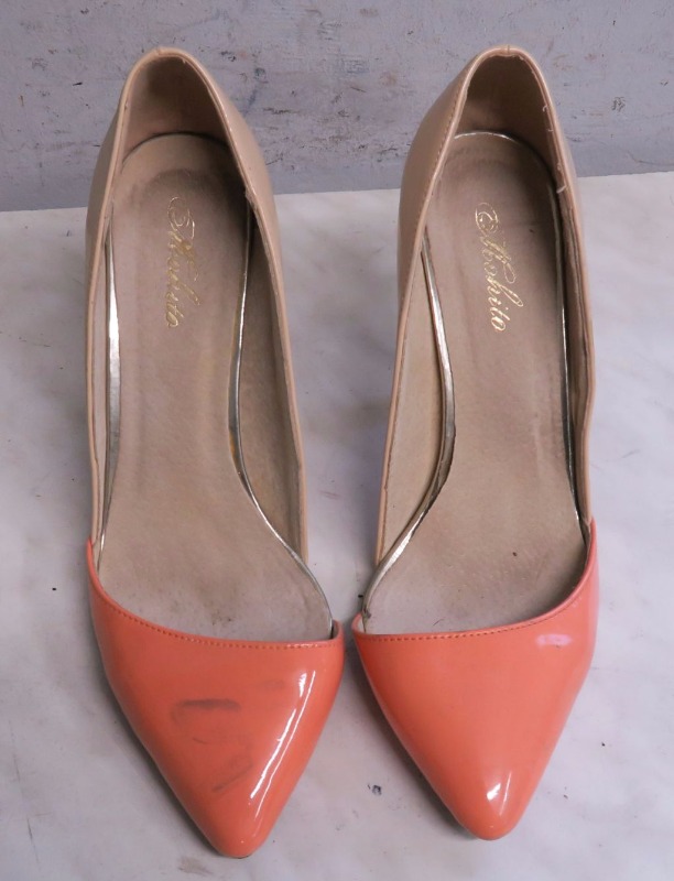W brzoskwiniowych czółenkach Mohito musieliśmy dokonać całościowego farbowania przodów cholewek. Oryginalny kolor był dosyć trudny do uzyskania, w związku z czym zapadła decyzja o farbowaniu na ciemny odcień cappuccino. Kolor bardzo zbliżony do oryginalnego wybarwienia brzegów spodów.
