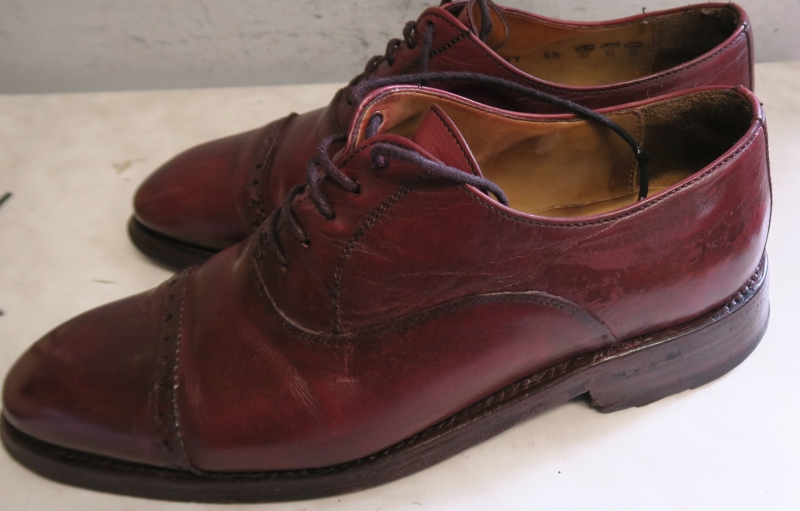 Buty po gruntownym odczyszczeniu za pomocą mocnej chemii. Usunięta została przy okazji apretura wykończeniowa, oraz wybarwienie oryginalne skóry :
