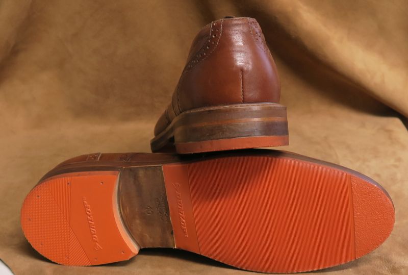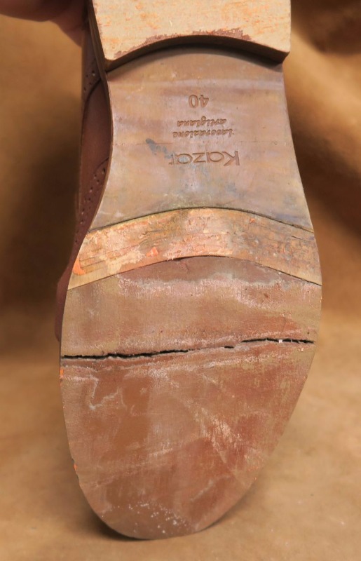 Naprawa butów polegała na wymianie fleków i zrobieniu nowych zelówek. Z racji tego, że posiadamy bardzo bogatą bazę materiałową, nowe spody wykonane zostały również w kolorze pomarańczowym, z jedną zasadniczą różnicą - będą znacznie bardziej trwałe niż oryginalne.
