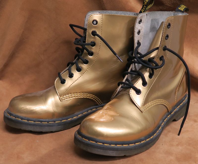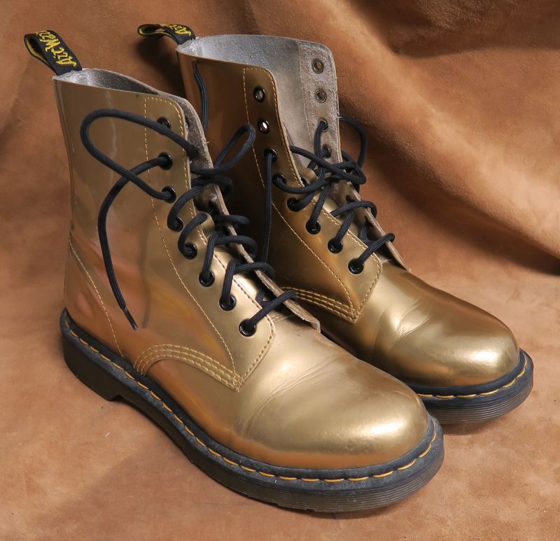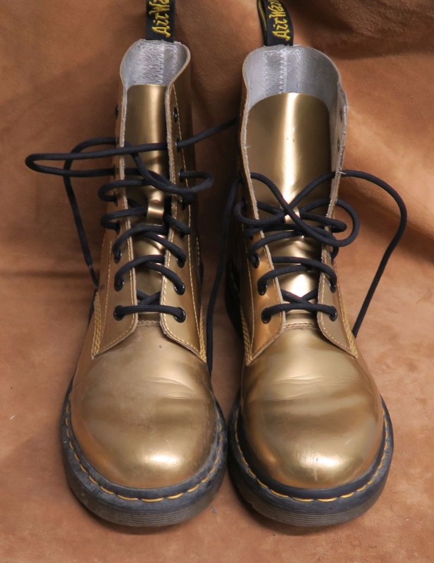 farbowanie Martensów z koloru złotego na czarny. Warto zwrócić uwagę, że po farbowaniu butów, obuwie nie straciło tego co je wyróżnia wśród innych butów. Pozostał ładny, subtelny połysk, oraz zachowane zostały żółte przeszycia, charakterystyczne dla tej marki obuwia.