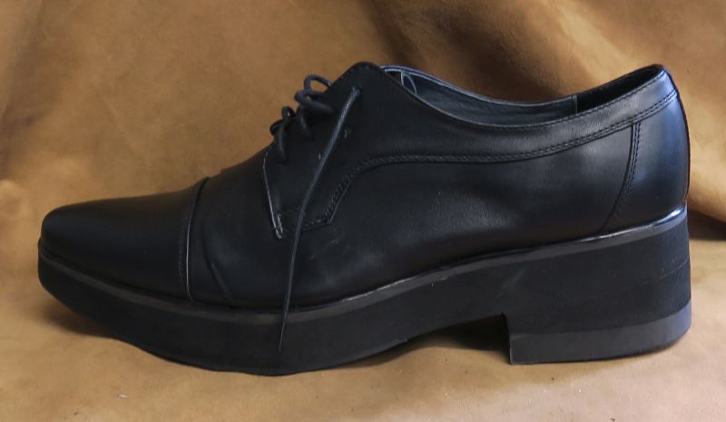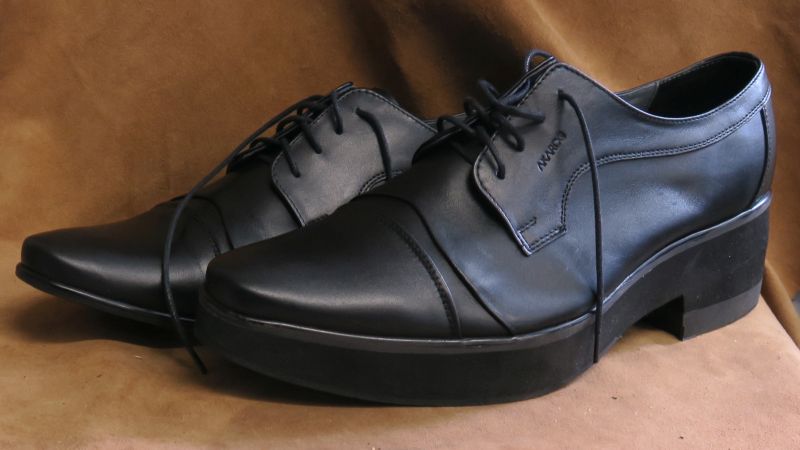 Buty po usłudze całościowego podwyższenia spodów. Obcas oryginalny został zeszlifowany, na całości spodów została położona warstwa wysokiej jakości styrogumy, następnie nadbudowany obcas, a na końcu całość spodów zabezpieczona przed ścieraniem się zelówką z tuniskóru, oraz flekiem.