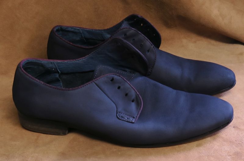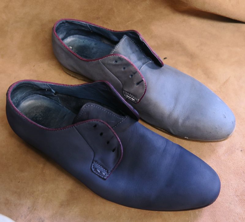 Wybarwienie skóry w nowych butach było w kolorze burzowego granatu. Z biegiem czasu, skóra stała się szara, ogólny jej wygląd nie był zachwycający. Przed wykonaniem ostatecznego farbowania, wykonaliśmy mikropróbę kolorystyczną, aby sprawdzić jak będzie zachowywał się barwnik na skórze. Skóra została również poddana