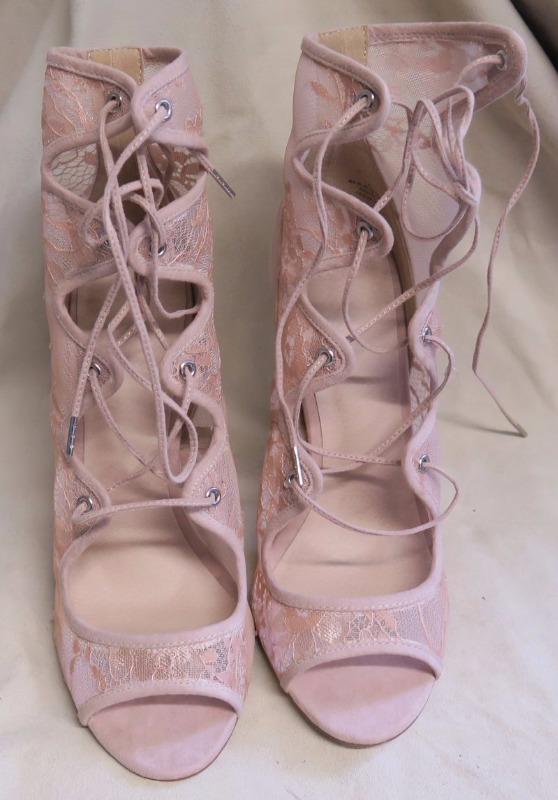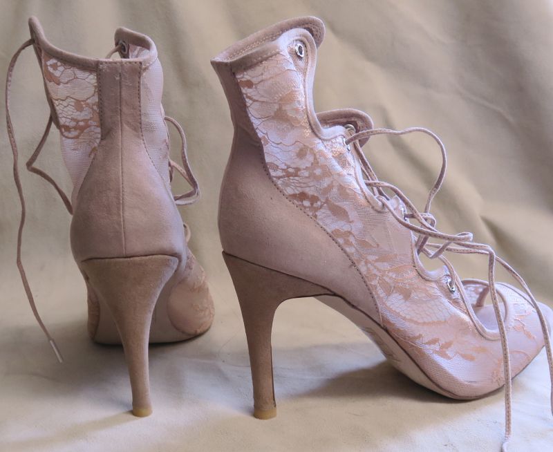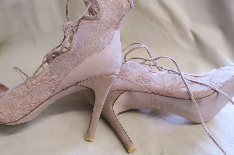 Sandałki koronkowe ze wysokimi obcasami. Buty na obcasach były za wysokie dla Klientki.