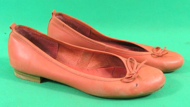 Baletki w kolorze łososiowym z otarciami lica skóry, oraz widoczną ciemną plamką z przodu. Zafarbowane zostały na głęboki czerwony kolor, cieniowane, z mocniejszym zaakcentowaniem czubków.