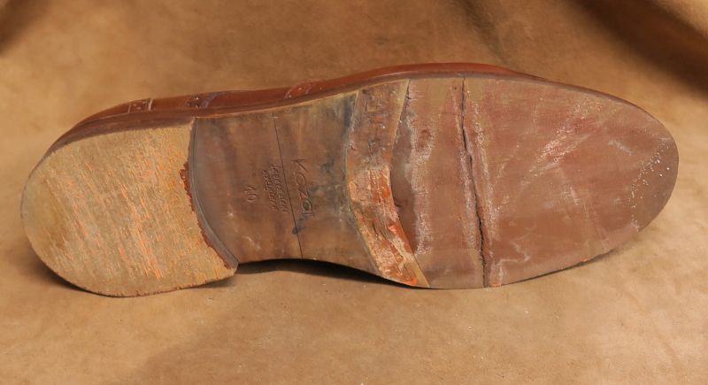 Męskie buty Kazara, w których starły się podeszwy i fleki. O ile cholewki butów wyglądają jeszcze akceptowalnie, tak już z podeszwami sprawa nie była wesoła.