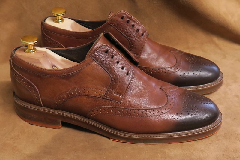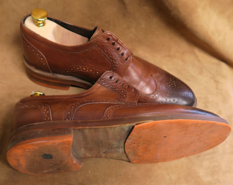 Brązowe brogsy Kazar przed i po naprawie.