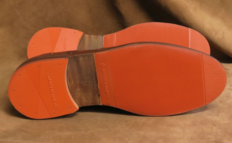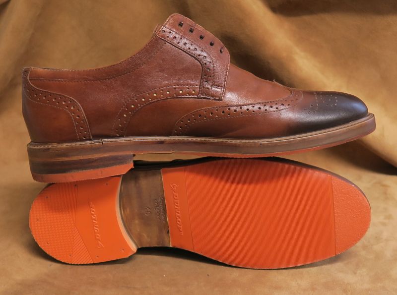 Naprawa butów polegała na wymianie fleków i zrobieniu nowych zelówek. Z racji tego, że posiadamy bardzo bogatą bazę materiałową, nowe spody wykonane zostały również w kolorze pomarańczowym, z jedną zasadniczą różnicą - będą znacznie bardziej trwałe niż oryginalne.