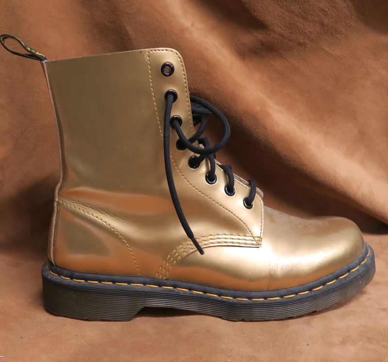 farbowanie Martensów z koloru złotego na czarny. Warto zwrócić uwagę, że po farbowaniu butów, obuwie nie straciło tego co je wyróżnia wśród innych butów. Pozostał ładny, subtelny połysk, oraz zachowane zostały żółte przeszycia, charakterystyczne dla tej marki obuwia.
