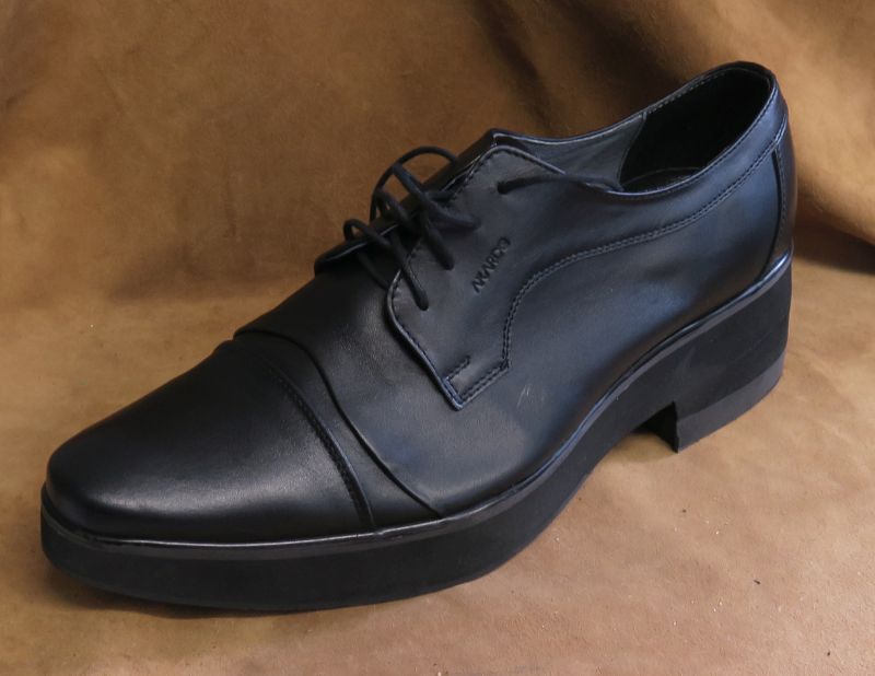 Buty po usłudze całościowego podwyższenia spodów. Obcas oryginalny został zeszlifowany, na całości spodów została położona warstwa wysokiej jakości styrogumy, następnie nadbudowany obcas, a na końcu całość spodów zabezpieczona przed ścieraniem się zelówką z tuniskóru, oraz flekiem.