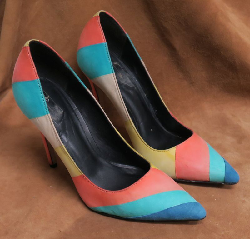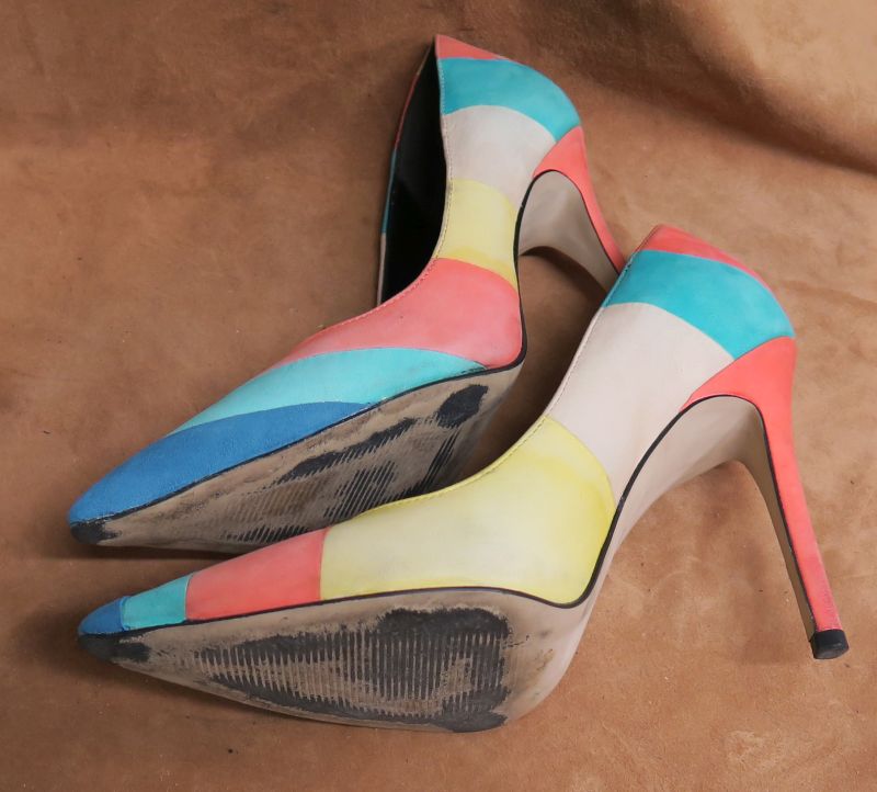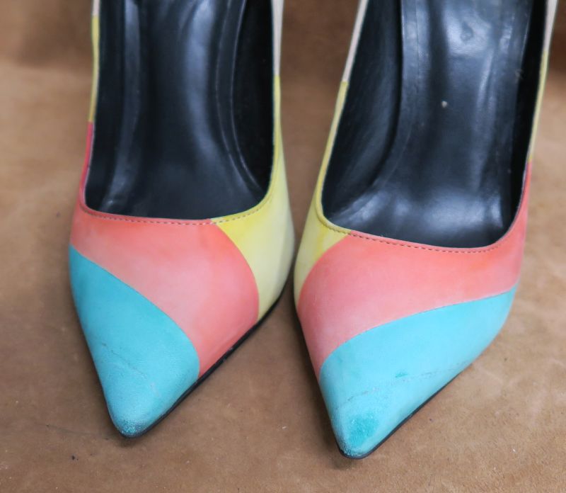 Zawsze w takich przypadkach należy podchodzić indywidualnie do danej pary butów. Po długim namyśle doszliśmy do wniosku, że najlepszym rozwiązaniem będzie wykorzystanie atutu oryginalnych cholewek szpilek, a głównie tego, że są one uszyte z pasków różnego koloru. Postanowiliśmy, że dołożymy na czubkach butów jeszcze jeden element, przez co buty nie zatracą swojego charakteru i po naprawie całość będzie ze sobą spójna.