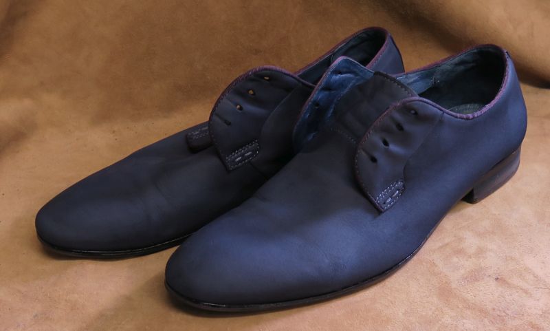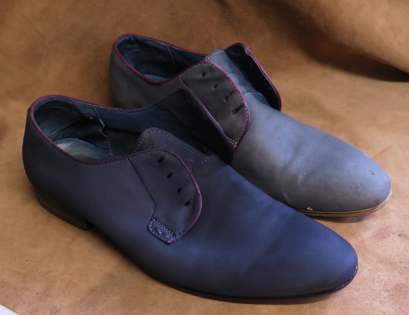 Wybarwienie skóry w nowych butach było w kolorze burzowego granatu. Z biegiem czasu, skóra stała się szara, ogólny jej wygląd nie był zachwycający. Przed wykonaniem ostatecznego farbowania, wykonaliśmy mikropróbę kolorystyczną, aby sprawdzić jak będzie zachowywał się barwnik na skórze. Skóra została również poddana