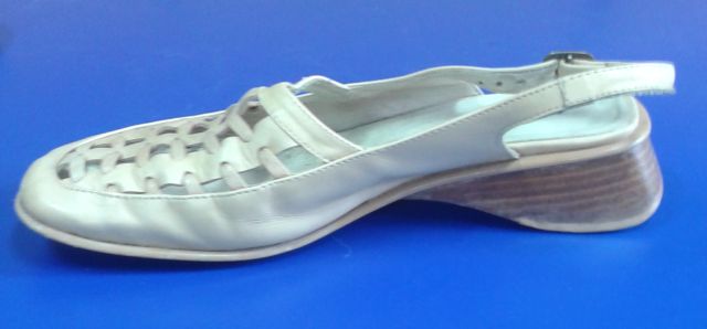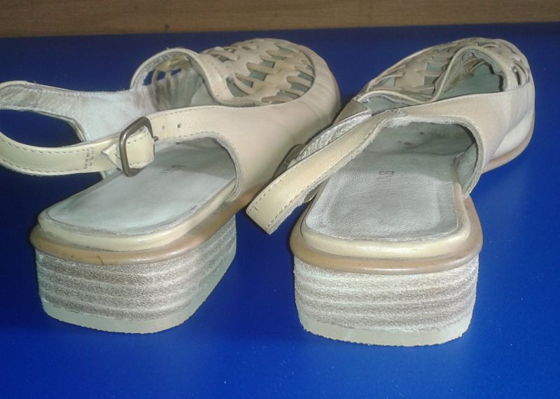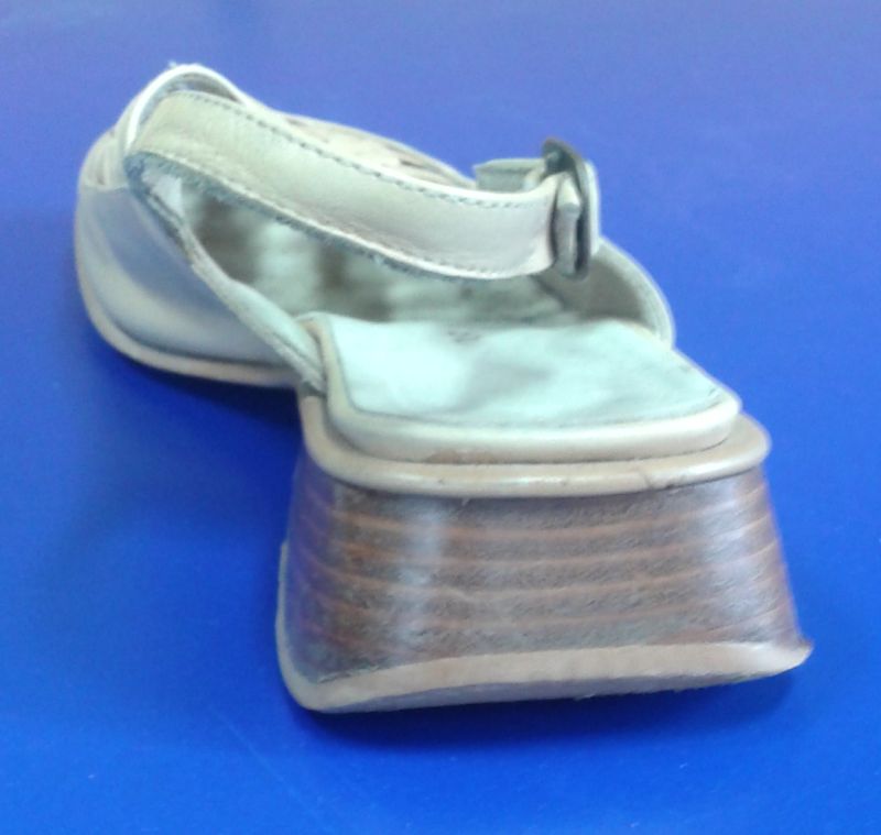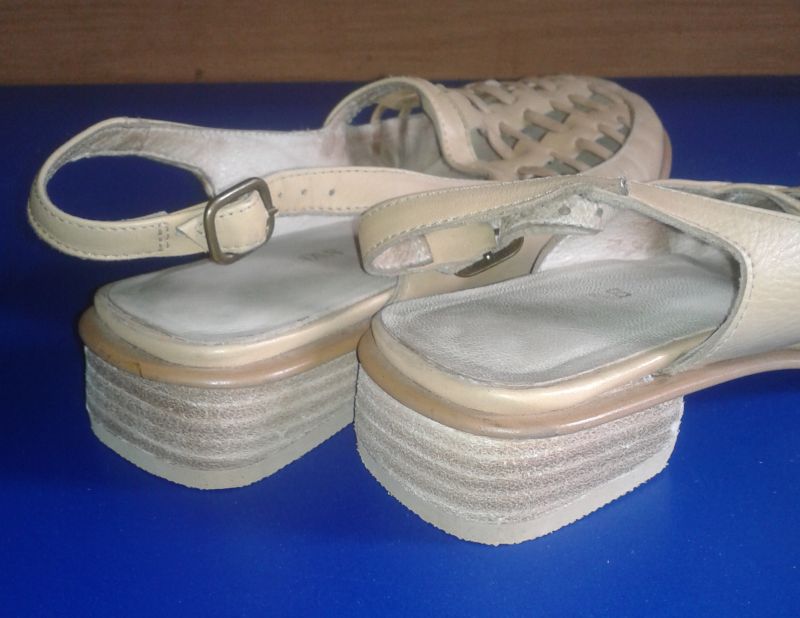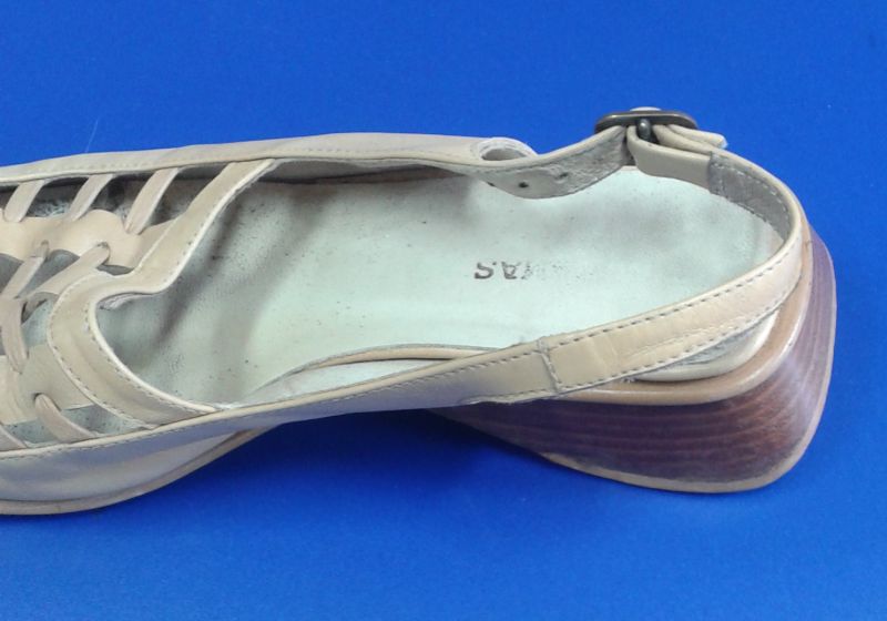 Poniżej przykład obuwia, posiadającego niemodne obcasy. W przypadku tych skórzanych sandałków, udało się całkowicie przemodelować oryginalne obcasy, które były bardzo szerokie, z wydłużoną podstawą, wystające poza obrys buta. Po odpowiednim wymodelowaniu, obcasy zostały obciągnięte specjalną skórą.
