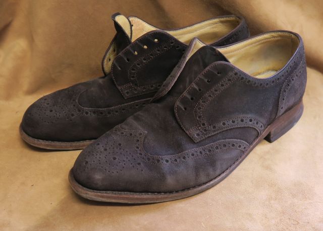 Buty, to prawdziwie ręczna robota, szyte metodą Goodyer. Trafiły do naszego serwisu, bowiem z biegiem czasu, wymagają "kapitalnego remontu", obejmującego renowację zamszu, oraz wymianę spodów skórzanych i fleków.